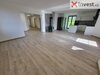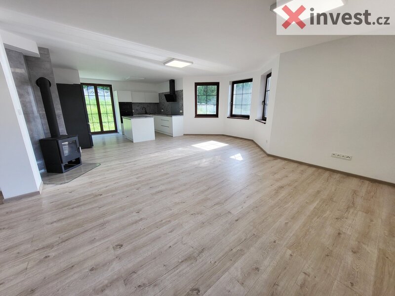 prostor v domě. Vpravo prostorná hlavní obytná místnost s kuchyní a