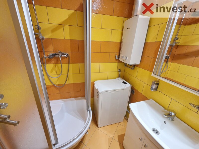 koupelna se sprchovým koutem a pračkou, samostatné WC. V kuchyni